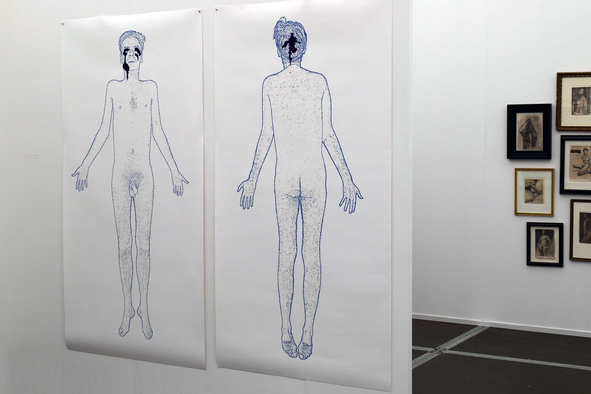 ‘De tweede editie van TH.EVERYTHING toonde op de cover mij naakt met bebloed hoofd. Dit naar aanleiding van een mishandeling door twee man op een avond die diepe sporen in mijn leven heeft achtergelaten. Er vervolgens iets creatiefs mee doen zit in mijn DNA. Deze en een vergelijkbare tekening van mijzelf van de achterkant, ook een bebloed beeld, zijn als tweeluik tentoongesteld.'